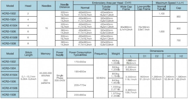 Newly developed Compact Multi-head Embroidery machine HCR2 series has range of 2 heads till 8 heads with 7inch touch screen control panel for a customer who requires production efficiency improvement for wide variety product in small lot production. 4 and 6head machines have the model of wider embroidery area (width:500mm).